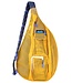 Sling pack with adjustable rope shoulder strap and side release buckle, elastic webbing keeper at strap end, two vertical zip compartments, two key or cell phone pockets, padded back with KAVU embroidery